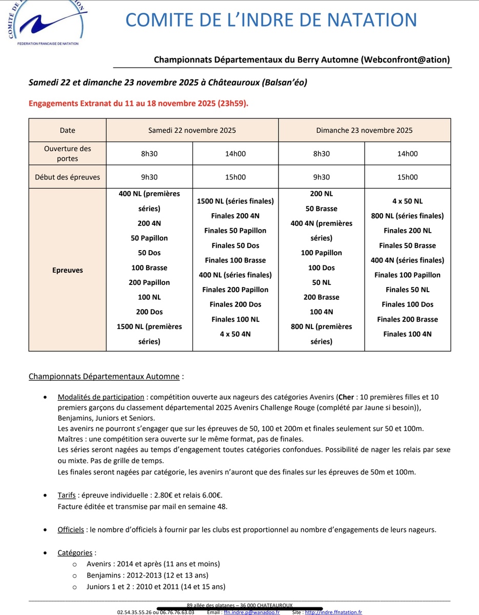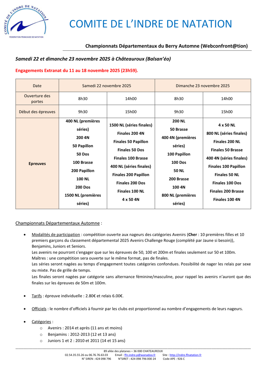Anciennement Championnats départementaux, cette compétition regroupe les nageurs du Cher et de l'Indre.